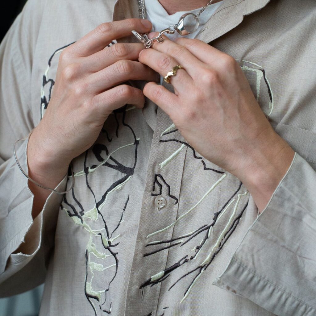 The artwork extended into a five-piece shirt collection, each thoughtfully reworked from secondhand garments with embroidered motifs of moth wings and waiting landscapes.