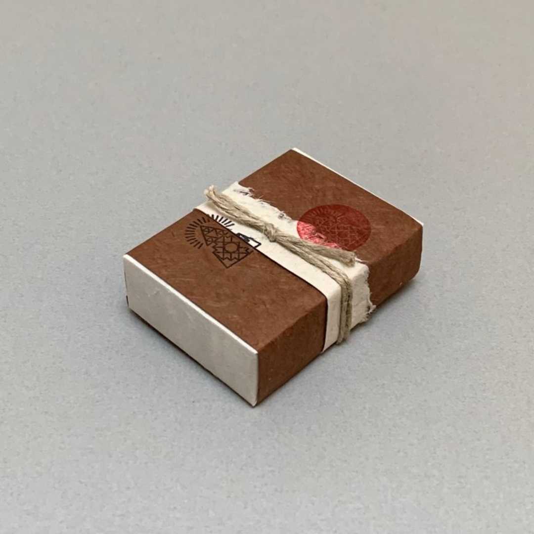 A small batch cold processed soap with 15 different essential oils such as lavender, coriander, patchouli, cardamom, marjoram, clove, cinnamon, vetiver, geranium and more. Softly gliding from one palm to the other, it nourishes our hands with care and enjoyment. Hand-wrapped with Traditional Nepalese Lokta paper.