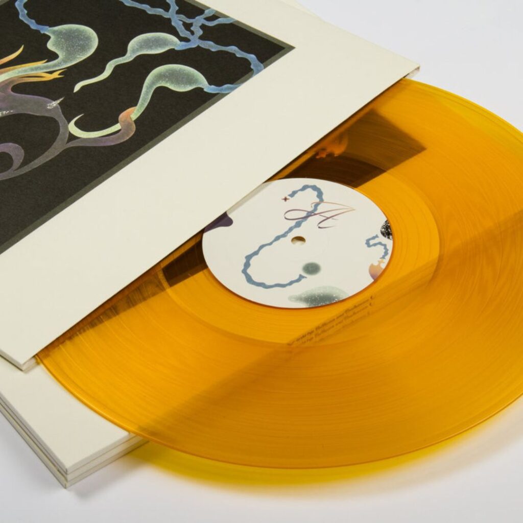 The artwork by Mevlana Lipp is showing a strange, exotic plant, which is agile and seems somehow alive. Also some of its forms remind me of sperms. You could interpret it as a living being, which recreates itself through passing its seed, helping its offspring to spread. We thought that the motif with its stylistic realisation of the artwork, the clear shapes and the vibrating colours, which especially emerge in front of of the black background, resonates very well with our music world, as it could be a soundtrack for the plant-creature’s planet.
