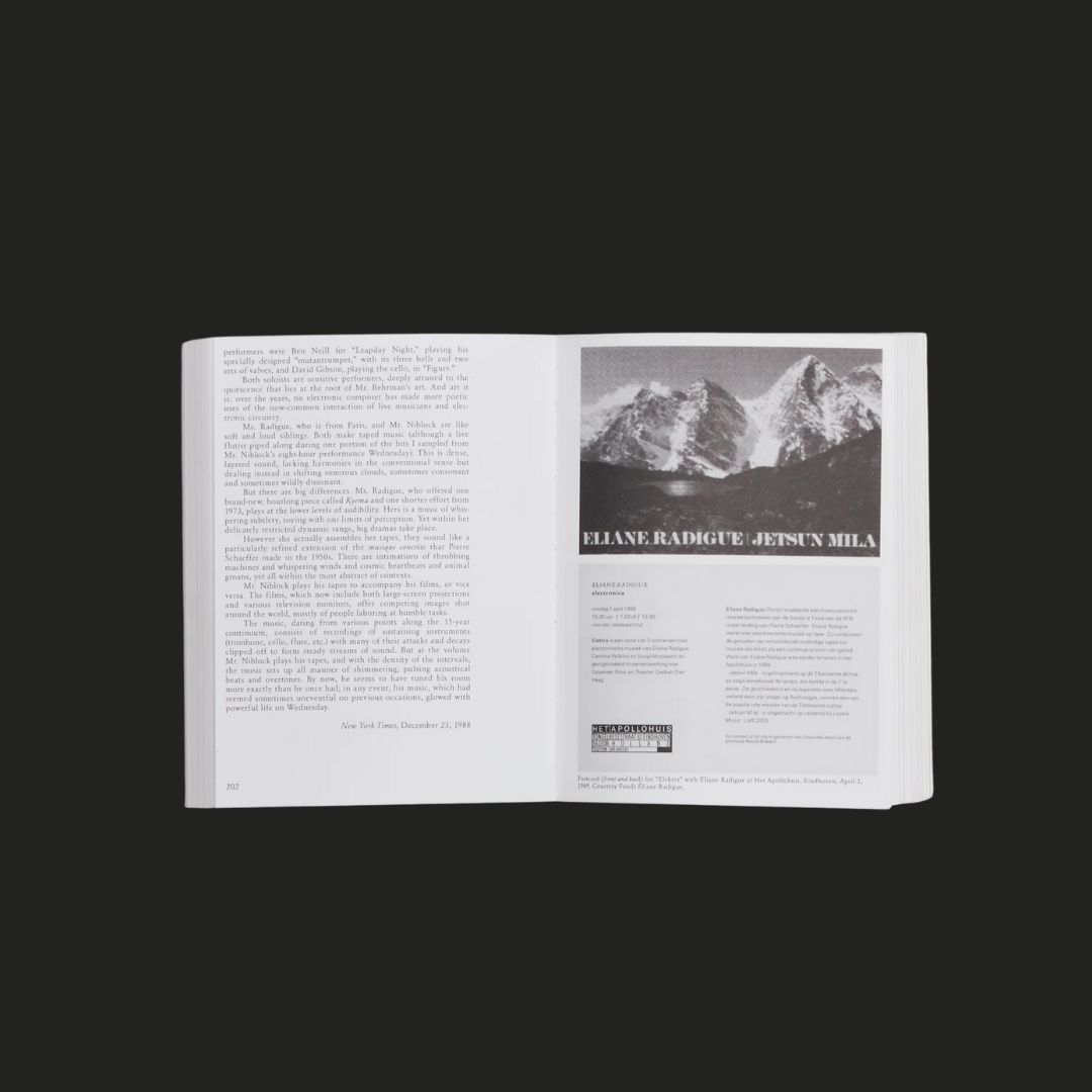Sketches for unrealized works, contemporary reviews, concert programs, and other ephemera tracing the performance history of Radigue’s early output are presented together for the first time. The anthology concludes with a roundtable discussion between Curtis, Greenstone, and Anthony Vine, unraveling the paradoxes at the core of Radigue’s artistic vision to follow the thread of her enduring “ethos of resistance.”