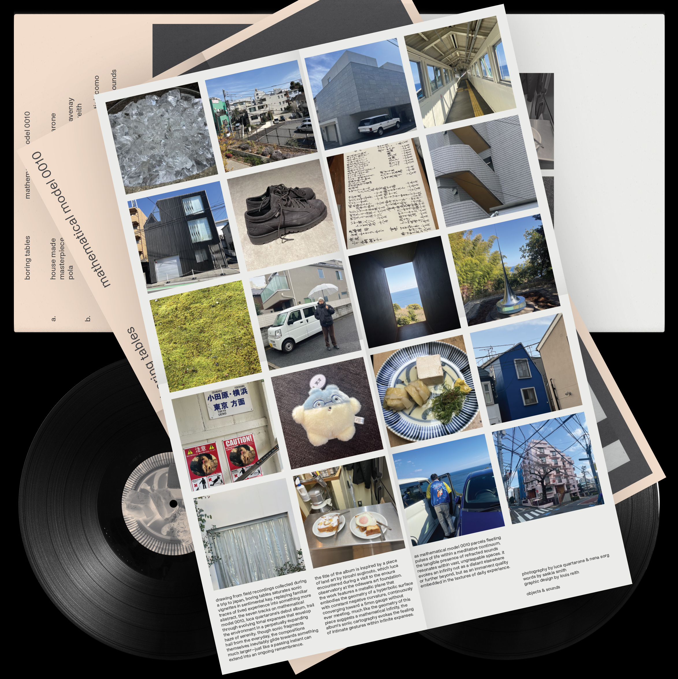 Drawing from field recordings collected during a trip to Japan, boring tables saturates sonic vignettes in sentimental key, replaying familiar traces of lived experience into something more abstract. The seven tracks on mathematical model 0010, Luca Quartarone's debut album, trail through evolving tonal expanses that envelop the environment in a perpetually expanding haze of serenity. Though sonic fragments hail from the everyday, the compositions themselves inevitably glide towards something much larger—just like a passing instant can extend into an ongoing remembrance.