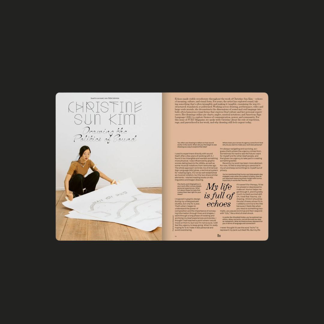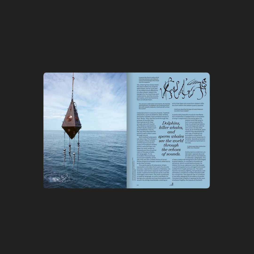 From graphic scores and musical structures to resonance, vibration, and listening, this issue brings together artists who turn sound into image and image into sound. Some works follow the pulse of music, others trace the invisible currents of electromagnetic fields, the voices of whales, or the inner sound of thought and memory.