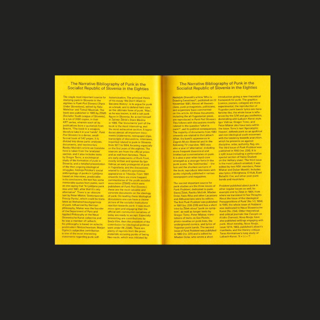 The book also includes a foreword on the historical context of the 1980s and an extensive narrative bibliography of punk-related publications in the Socialist Republic of Slovenia, written by Sezgin Boynik. Additionally, it features translations of two editorials from Punk Problemi by renowned Slovenian theoreticians.
