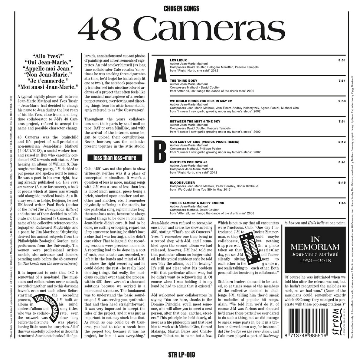 48 Cameras was the brainchild and life project of self-proclaimed non-musician Jean-Marie Mathoul († 04/07/2018), a social worker born and raised in Huy who carefully conducted 48C towards cult status. After hearing an album of William S. Burroughs reciting poetry, J-M decided to put poems and spoken word to music. He was a poet in his own right, having already published a.o. Une cure au cancer (A cure for cancer), a book of poems which at times was wrongly sold alongside medical books. At a literary event in Liège, Belgium, he met UK-based writer Paul Buck (author of the novel The Honeymoon Killers) and the two of them decided to collaborate and thus formed 48 Cameras. The name of the collective references photographer Eadweard Muybridge and a poem by Jim Morrison; "Muybridge derived his animal subjects from the Philadelphia Zoological Garden, male performers from the University. The women were professional artists' models, also actresses and dancers, parading nude before the 48 cameras" (in The Lords and the new creatures).