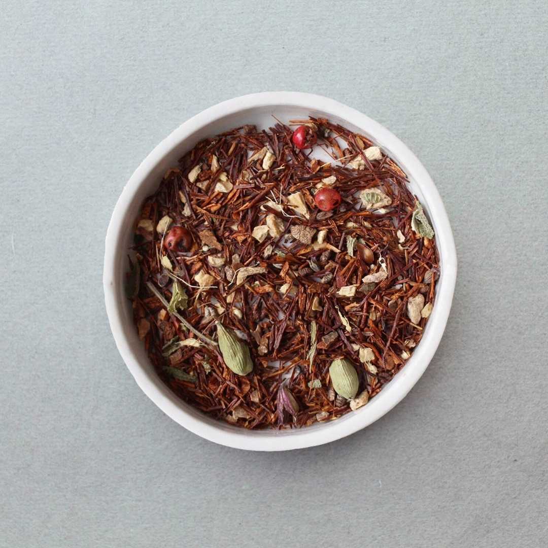 Ingredients: Rooibos, Cardamom, Cinnamon, Ginger, Sage, Pink Peppercorn