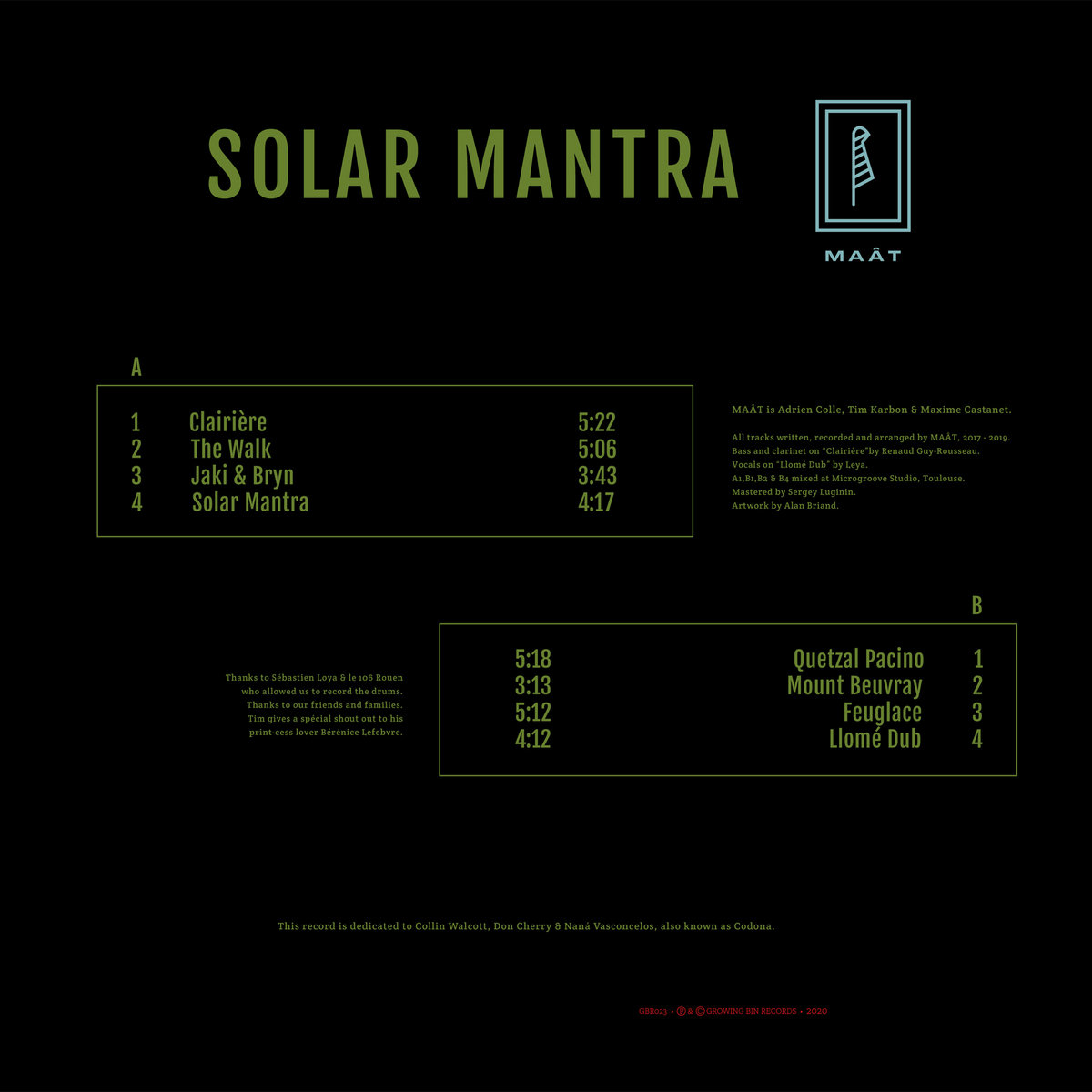 Maât takes you on a journey with this fresh LP, mapping out a Sunday stroll through the sun dappled streets of the Parisian banlieue on ’Solar Mantra’. Humming reeds converge into a pre-dawn chorus before dewy sequences and drifting syncopation signal sunrise over La Vilette, a perfect place to start ‘The Walk’. Skirting the Périphérique, the Parisian ensemble pick out a street percussionist by Boulevard d’Algérie then detour to Pré-Satint-Gervais to draw a bassline out of the Metro Area, adding an Environ cool to the uptempo ‘Jaki & Bryn’. With icy bells, brooding guitars and melancholic vocals, ‘Feuglace’ transports Miko’s garten to the 20th arrondissement while the polyrhythmic patter and micro-tuned guitars of ‘Solar Mantra’ see out the A-side with a fourth world hymn.