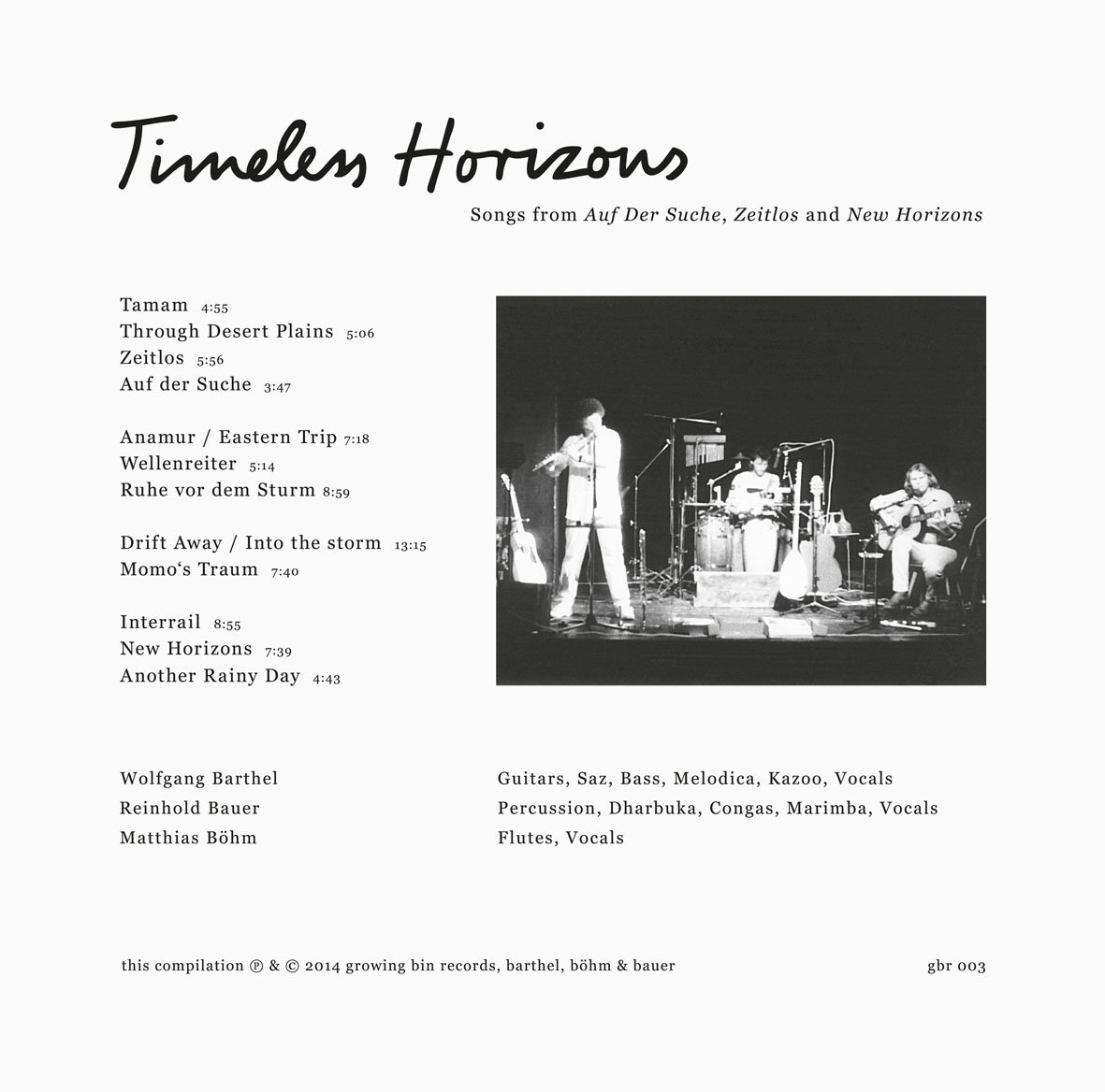 'Timeless Horizons' compiles songs from Wolfgang Barthel, Matthias Böhm and Reinhold Bauer that were self-released between 1984 and 1988. The result is an atmospheric album perfect for daydreaming.