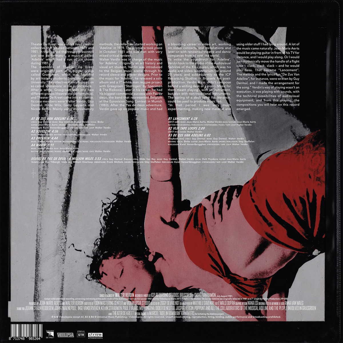 The premiere took place in October 1981 and was met with very mixed critical reviews. Walter Verdin was in charge of the music for 'Adeline'. Originally an art history and visual art student, Verdin was introduced to the Belgian music scene through his record sleeve and poster designs. Prior to the music for 'Adeline', he released a solo album and a 7” white man reggae project with Grasgroen ('Storingen' by Specimen & The Rizikoos). Later in his career, he had his biggest commercial success with Pas de deux, the band that represented Belgium at the Eurovision Song Contest in Munich (1983). After the Pas de deux adventure, Verdin gave up on popular music and had a blooming career in video art, working on video concerts and installations and later on with renowned theatre and dance companies from all over the world.